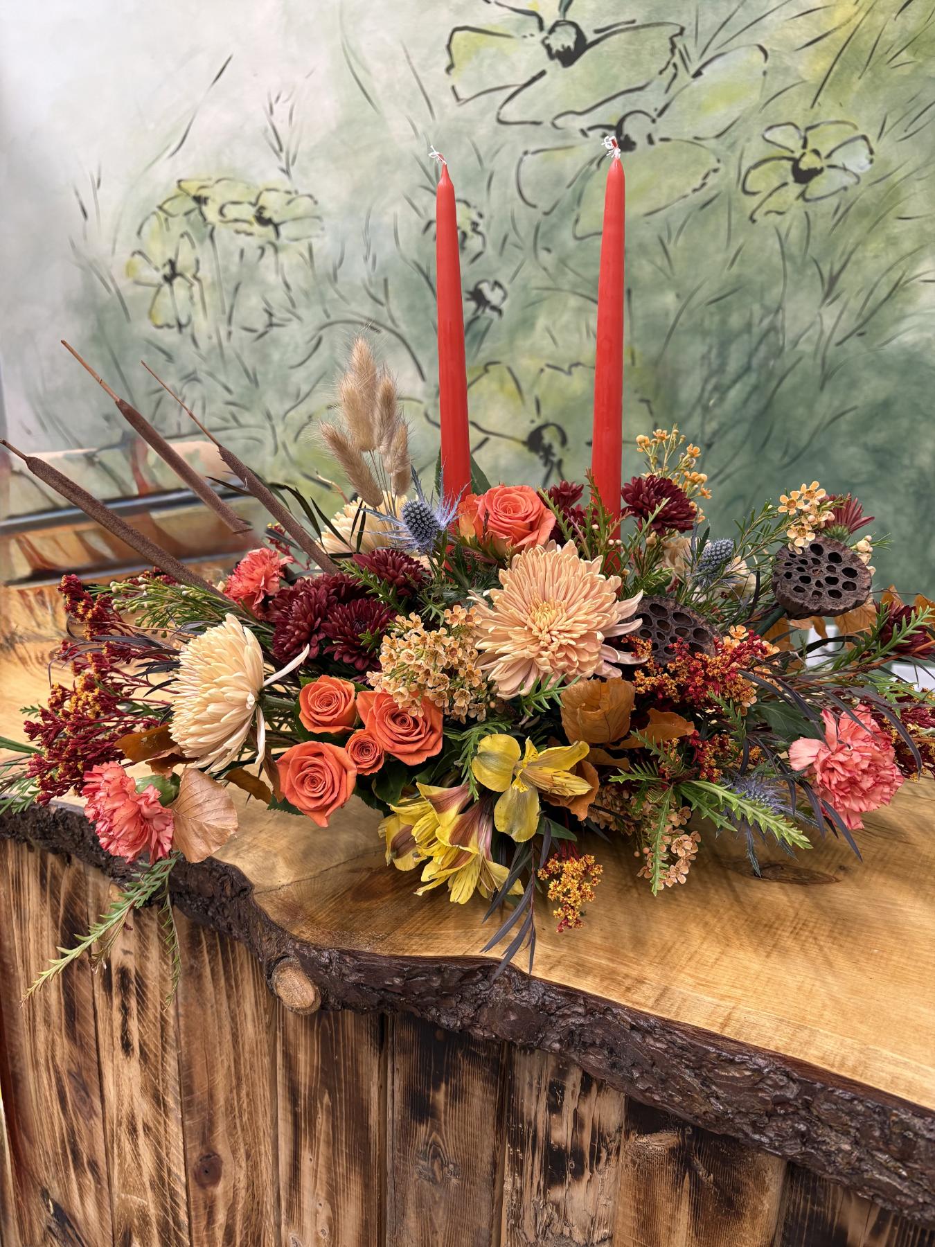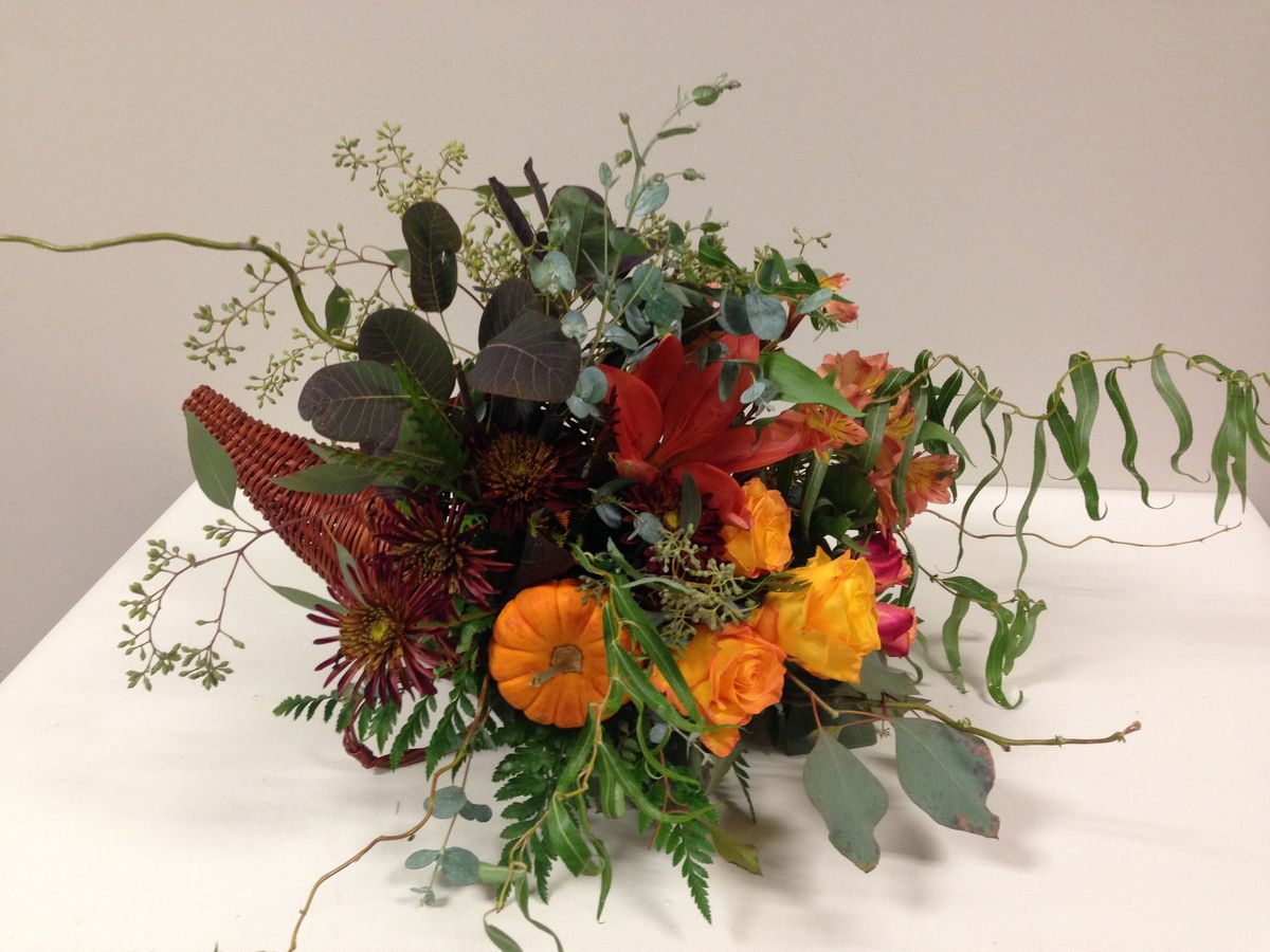 Not your typical design. Have some fun creating an arrangement spilling out of a cornucopia!